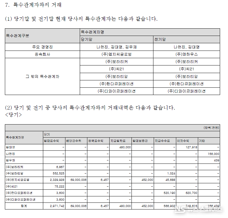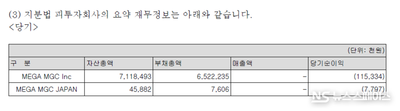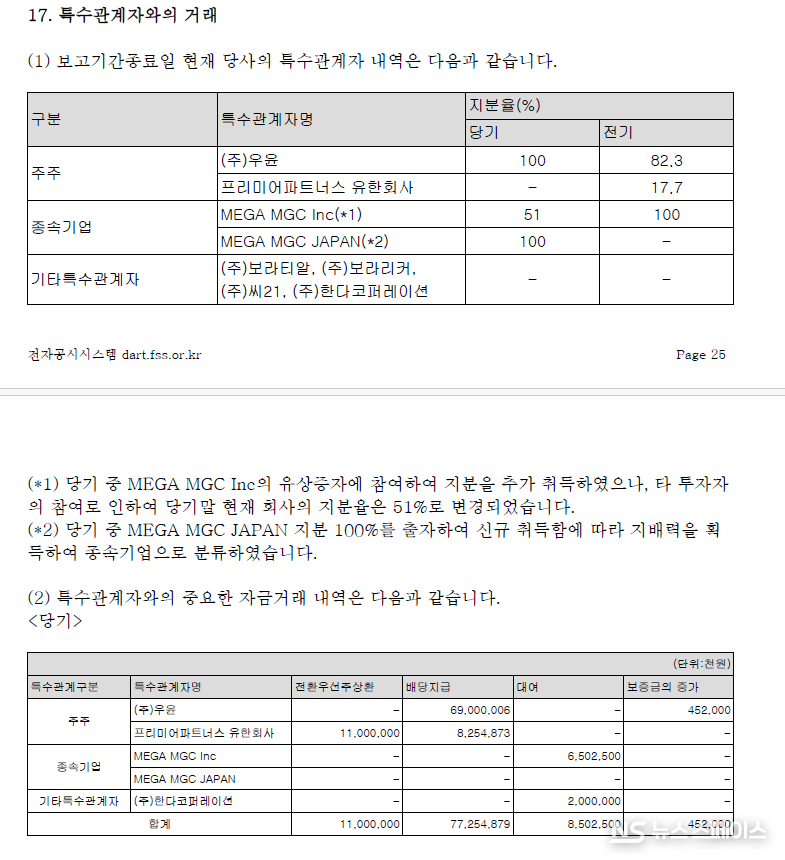 이와 함께 전환상환우선주 상환 명목으로 프리미어파트너스 유한회사에 110억원을 추가 지급했으며, 종속기업 MEGA MGC Inc(미국)와 (주)한다코퍼레이션에 대한 대여금도 85억원에 달했다. 이를 합산한 특수관계자 관련 자금 유출은 총 967억원을 초과한다.
