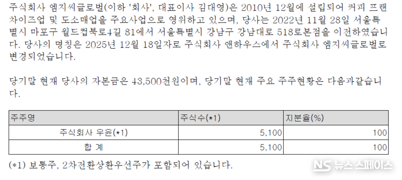 또한 국채를 포함한 매도가능증권에 120억 1700만원을 신규 투입했으나, 기말 현재 국채 평가손실만 15억 7900만원이 발생해 기타포괄손익누계액을 잠식했다. 건설중인자산 계정에도 40억원이 신규 계상돼 추가적인 자산 투자가 진행 중임을 시사했다. 사명도 2025년 12월 18일자로 '주식회사 앤하우스'에서 '주식회사 엠지씨글로벌'로 변경했다.