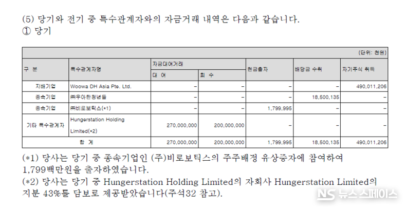 매출 규모와 역비례해 당기순이익마저 전년보다 13% 줄어드는 동안, 회사는 모회사(지배기업)인 Woowa DH Asia Pte. Ltd.에 자기주식 취득 명목으로 4,900억원의 현금을 내보냈다. 여기에 최상위 지배기업 Delivery Hero SE(독일)에 대한 IT시스템 이용료 등 특수관계자 비용 지출이 761억원에 달하는 것으로 밝혀졌다.