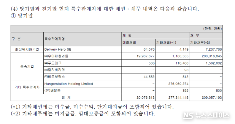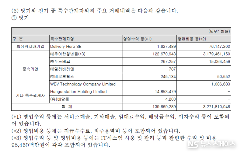 주석은 "IT시스템 사용 및 관리 등과 관련한 수익 및 비용 954억 6,000만원이 각각 포함되어 있다"고 밝히고 있어, 구체적인 로열티 및 테크피(tech fee) 성격 비용이 사실상 수백억원 규모임을 시사한다. 전기에도 Delivery Hero SE에 645억원을 지급한 것과 비교하면 전년 대비 18.0% 늘어난 것이다.