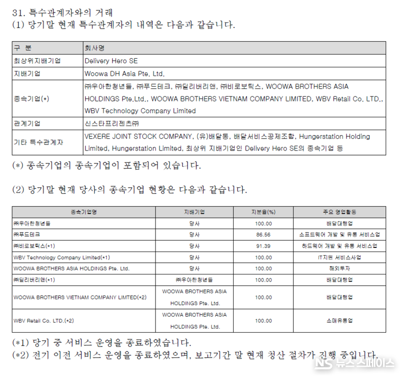 당기 중 ㈜비로보틱스, ㈜딜리버리앤, WBV Technology Company Limited 등 여러 종속기업이 서비스 운영을 종료했으며, WOOWA BROTHERS VIETNAM COMPANY LIMITED와 WBV Retail Co. LTD. 등 해외법인들은 청산 절차가 진행 중이다.