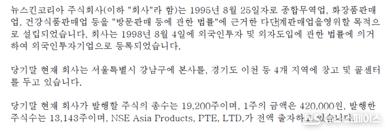 기업재무분석 전문가는 "2024년 300억원, 2025년 450억원 등 2년간 배당 총액 750억원은 같은 기간 당기순이익 합계(332억원)의 2.26배에 달한다. 여기에 연간 100억원대의 기술사용료까지 더하면, 한국 법인이 국내에서 창출한 수익은 사실상 전액에 가깝게 해외로 환류되고 있는 셈이다"면서 "다단계판매 시장의 규제 강화, 소비 침체, 인구 구조 변화 속에서 이 같은 수익 구조가 지속될 경우, 국내 사업 기반의 투자 여력 약화라는 부메랑 효과가 불가피하다"고 지적했다.