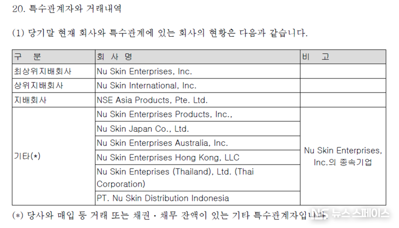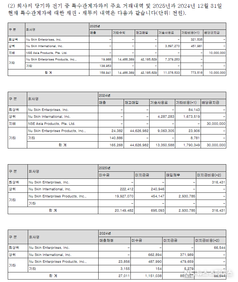 특수관계자 거래 내역에서도 이 구조가 명확히 확인된다. 2025년 Nu Skin International, Inc.에 지급한 기술사용료는 36억 9,727만원, Nu Skin Enterprises Products, Inc.에 지급한 기술사용료는 73억 7,926만원으로, 합산 110억 7,653만원이 모두 계열사에 지급된 것이다.