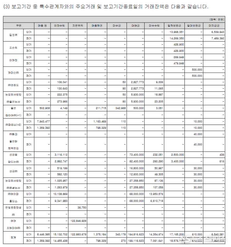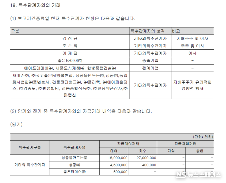 당기 중 특수관계자 자금거래를 보면, 성공을만드는㈜에 180억원을 새로 빌려줬고(회수 270억원), 성공㈜에 46억원을 추가 대여했다(회수 4억원). 특수관계자에 대한 이자수익만 당기에 151억 3000만원에 이른다.