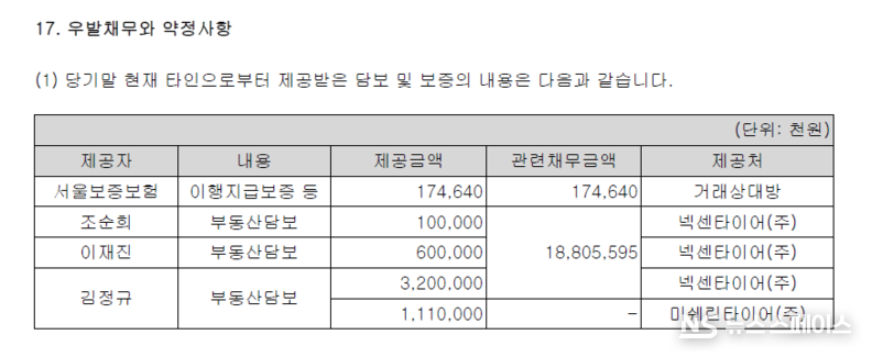 지배주주 김정규는 넥센타이어㈜를 위해 자신의 부동산을 32억원 규모로 담보 제공했고, 미쉐린타이어㈜를 위해서도 11억 1000만원 규모의 담보를 제공했다. 회사와 오너 사이의 이해관계가 복잡하게 얽혀 있음을 보여주는 대목이다.