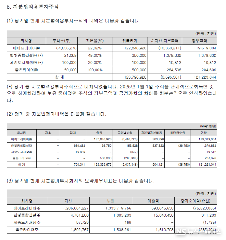 이번 감사보고서에서 가장 눈길을 끄는 대목은 에어프레미아㈜에 대한 대규모 신규 투자다. 타이어뱅크는 2025년 중 에어프레미아 주식 6465만 6278주(지분율 22.02%)를 취득하는 데 1228억 4700만원을 투입했다.
