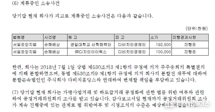 우발부채와 약정사항에 따르면, 다비치안경체인은 현재 두 건의 손해배상 소송에서 피고 입장에 서 있다. 서울중앙지법에서 경일대학교 산학협력단이 제기한 손해배상 1억 9,250만원, ㈜디자인아이웍스가 제기한 손해배상 1억원 등 총 2건, 소가 합산 2억 9,250만원 상당의 소송이 진행 중이다.
