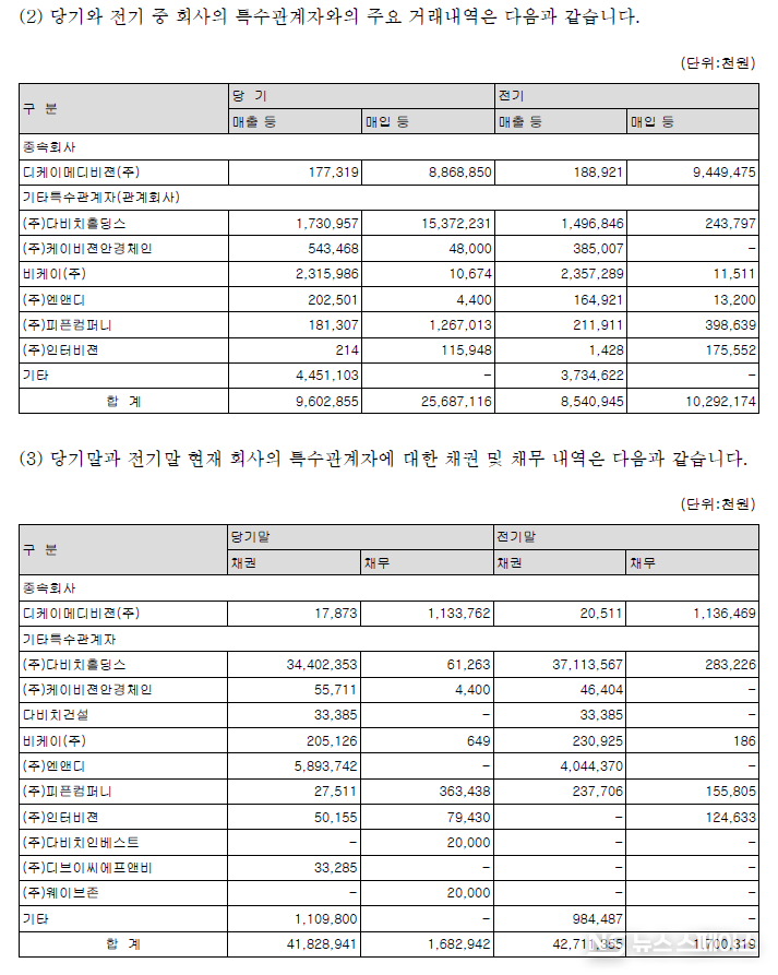 특수관계자 매입 거래(당기 256억 8,700만원)는 전기(102억 9,200만원) 대비 149.6% 폭증했는데, 이 중 (주)다비치홀딩스로부터의 매입만 153억 7,200만원에 달한다. 회사 총매출원가(1,219억원) 대비 이 단일 거래처 매입 비중은 12.6%에 달해 의존도가 집중되고 있음을 보여준다.