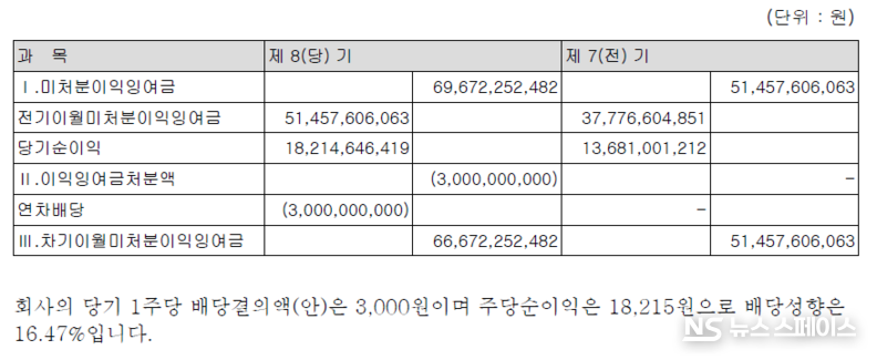 이익잉여금처분계산서에 따르면, 회사는 2025년 결산 기준 연차배당금 30억원(1주당 3,000원)을 결의했다. 배당성향은 16.47%다. 주목할 점은 자본금 구조상 발행 주식 100만주 전량이 "김인규(대표이사) 외 특수관계자"(지분율 100%)에게 귀속되어 있다는 사실이다.