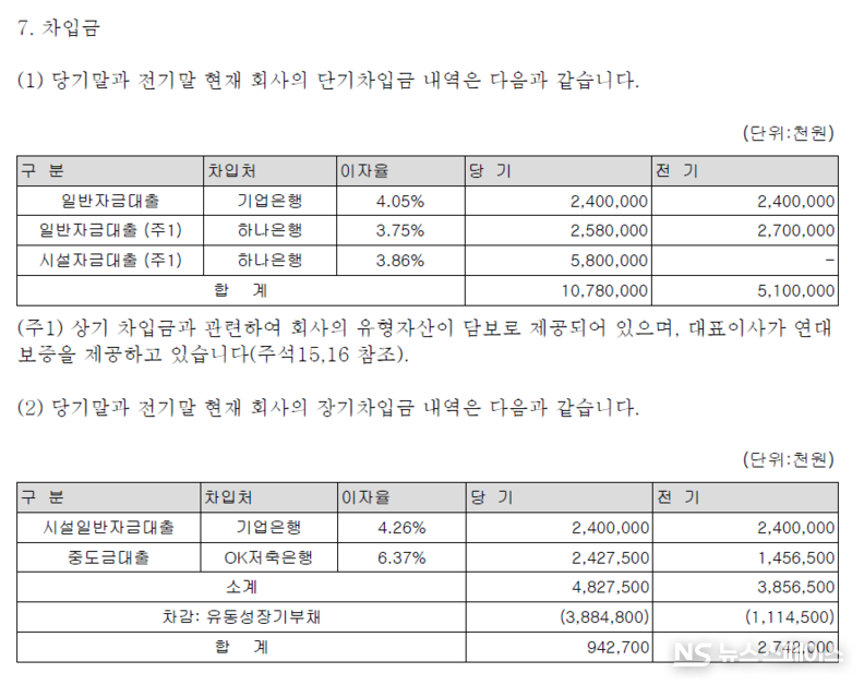 단기차입금은 107억 8,000만원으로 전년(51억원) 대비 111.4% 폭증했다. 차입처는 기업은행(연 4.05%, 24억원), 하나은행(연 3.75% 일반자금 25억 8,000만원, 연 3.86% 시설자금 58억원)이며, 대표이사가 하나은행 차입금 36억원에 연대보증을 제공하고 있다.