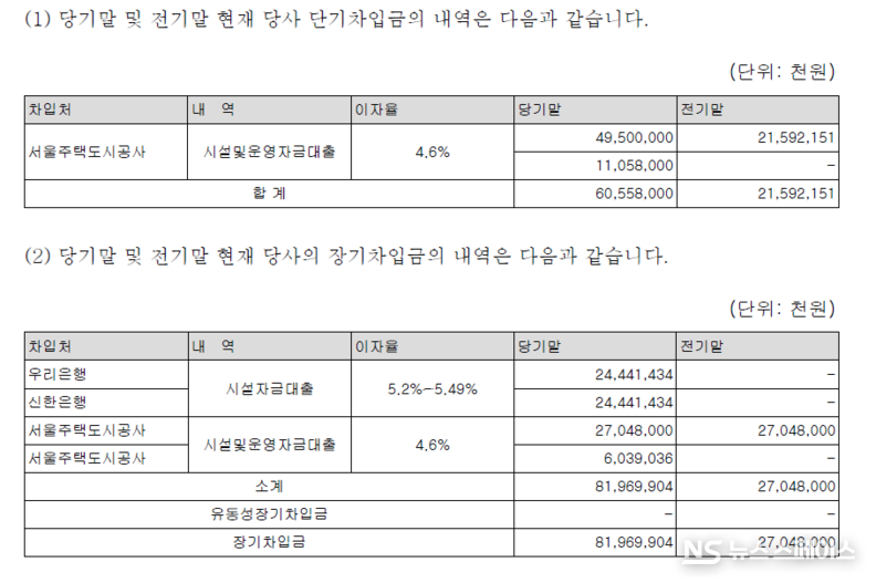 단기차입금은 605억 5,800만원이며 전액 서울주택도시공사로부터 빌린 시설·운영자금 대출(이자율 4.6%)이다. 장기차입금은 819억 6,990만원으로, 우리은행 244억 4,143만원, 신한은행 244억 4,143만원, SH공사 330억 8,697만원으로 구성됐다. 단·장기 차입금을 합산한 총차입금은 1,425억 2,790만원으로 집계됐다.
