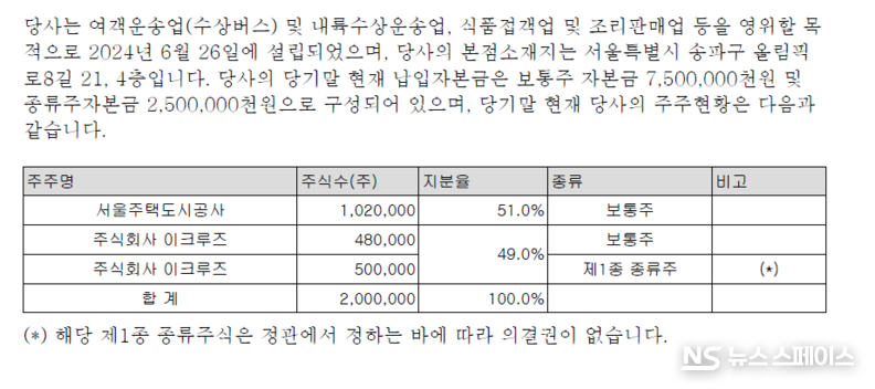 주주 구성을 보면 SH공사가 보통주 51%(102만 주)를 보유하고, 민간사업자인 주식회사 이크루즈가 보통주 49%(48만 주) 및 의결권 없는 제1종 종류주 50만 주를 합산해 전체 발행주식 200만 주의 절반을 실질 보유하고 있다. 공공기관과 민간사업자가 반반씩 나눈 구조다.