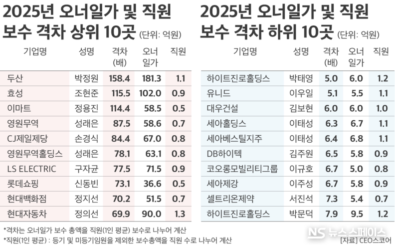 대기업집단 오너 중 일반 직원 평균 보수의 100배 이상을 받은 인물은 박정원 두산그룹 회장, 조현준 효성그룹 회장, 정용진 신세계그룹 회장 등 3명이었다. 반면, 박태영 하이트진로홀딩스 사장은 직원 평균 보수와의 격차가 5.0배로 가장 작았다.