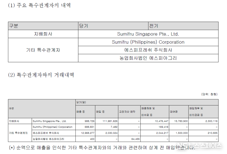 특히 이 회사는 지분 100%를 보유한 싱가포르 지배법인(Sumifru Singapore Pte., Ltd.)에 대한 매입액이 1,199억원에 달해 매출의 약 71.7%가 사실상 본사 방향으로 흘러가는 구조를 유지하고 있어, 국내 수익이 해외 모회사로 집중 귀속되는 전형적인 외국인투자기업의 '이익 빨아들이기' 패턴이 재연되고 있다는 비판이 나온다.