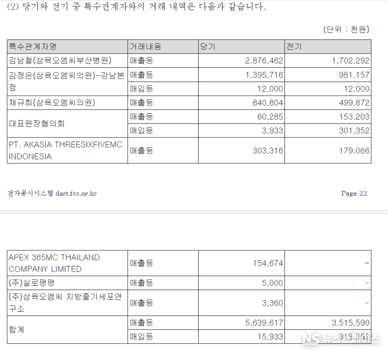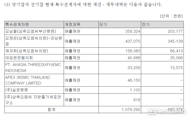 특수관계자와의 매출 거래는 전년 35억 1,559만원 대비 60.4% 급증해 전체 매출의 20.7%에 달한다. 거래 상대방은 대표이사 김남철이 운영하는 삼육오엠씨부산병원(28억 7,646만원), 임원 김정은이 운영하는 삼육오엠씨의원 강남본점(13억 9,572만원), 임원 채규희의 삼육오엠씨의원(8억 4,080만원) 등이다. 회사 경영진이 지분을 보유한 가맹의원들이 본사 매출의 5분의 1 이상을 차지한다는 구조는 내부거래의 공정성 시비를 낳을 수 있는 지점이다.