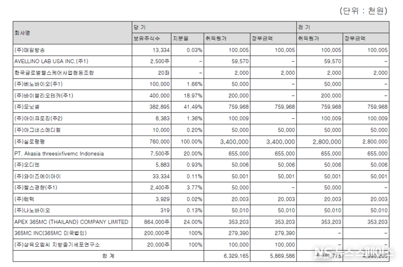 2025년 글로벌 및 신사업 확장에 공격적으로 베팅했다. 미국법인 365MC INC(지분율 100%, 취득원가 2억 7,939만원)와 삼육오엠씨 지방줄기세포연구소(지분율 100%, 취득원가 1억원)를 신규 설립·투자했으며, 100% 자회사 (주)실로팽팽에 대한 투자도 기존 28억원에서 34억원으로 6억원 추가했다.