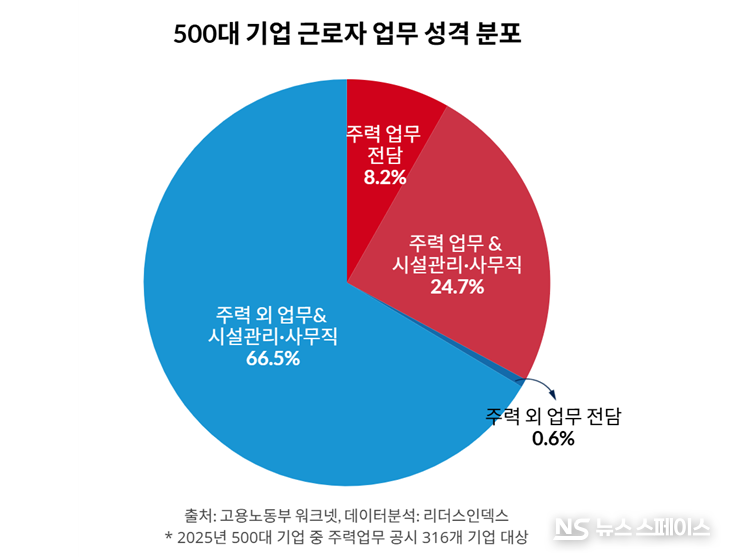 주요 업무를 공시한 기업 316곳(미공시 184곳 제외) 기준으로 보면, 소속 외 근로자가 본업인 주력 업무만 수행하는 경우는 26곳(8.2%)에 불과했다.