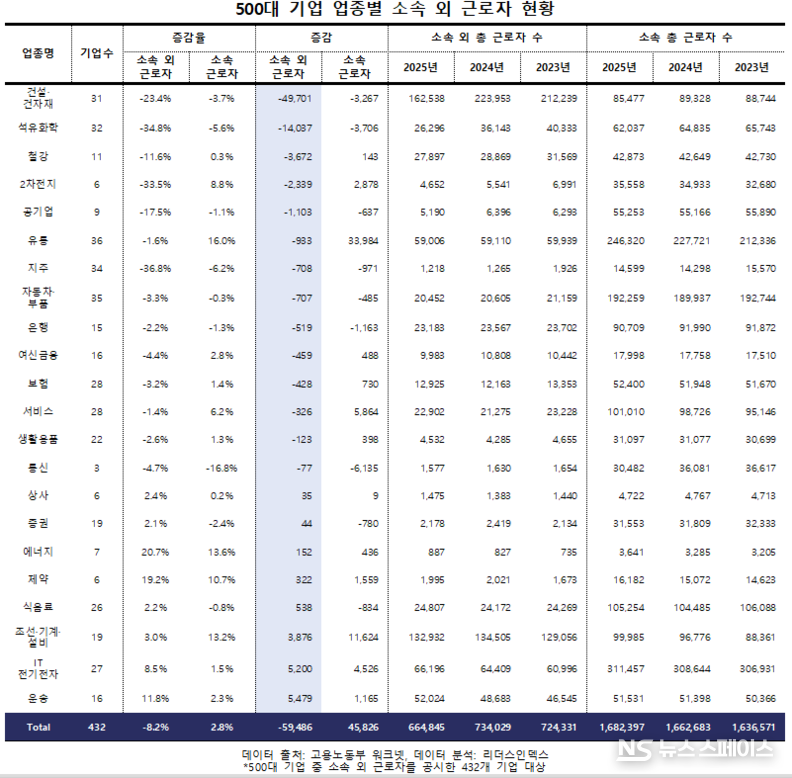 철강 업종은 소속 근로자 수가 0.3% 증가하는 동안 소속 외 근로자는 11.6% 감소했다. 이 가운데 포스코의 행보가 두드러진다. 포스코는 2025년 기준 1만4755명의 소속 외 근로자 중 절반가량을 직고용으로 전환하기로 올해 이사회에서 결정했다. 500대 기업 중 대규모 직접 고용 전환을 공식화한 유일한 사례로, 향후 데이터에 반영될 경우 철강 업종의 감소폭은 더욱 확대될 전망이다.