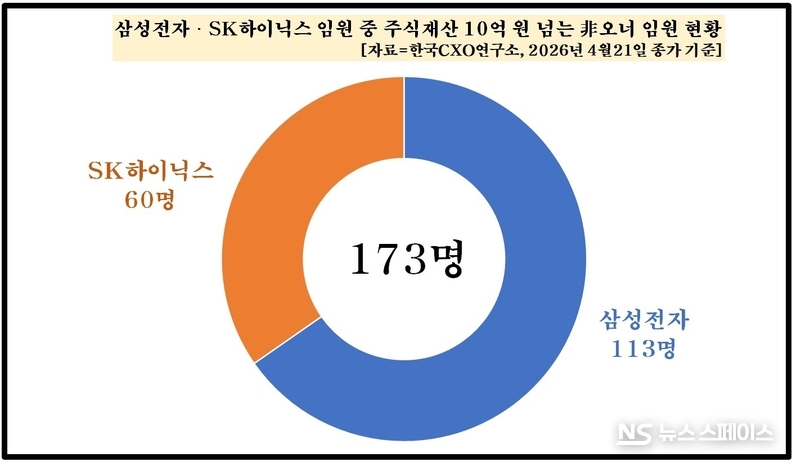 [뉴스스페이스=이현주 기자] 삼성전자와 SK하이닉스 주가 상승 영향으로 두 종목에서만 이달 21일 기준 주식평가액이 10억원을 넘는 비(非)오너 임원은 170명을 훌쩍 웃돈 것으로 나타났다. 이는 지난해 10월 조사 당시 파악된 30여 명과 비교해 5배 이상 증가한 수치다. 특히 주식재산 ‘100억 클럽’에 이름을 올린 임원도 3명으로 파악됐다. 삼성전자 노태문 사장이 200억원대로 가장 높은 평가액을 기록한 가운데, SK하이닉스 곽노정 사장도 처음으로 100억 클럽에 진입해 눈길을 끌었다.