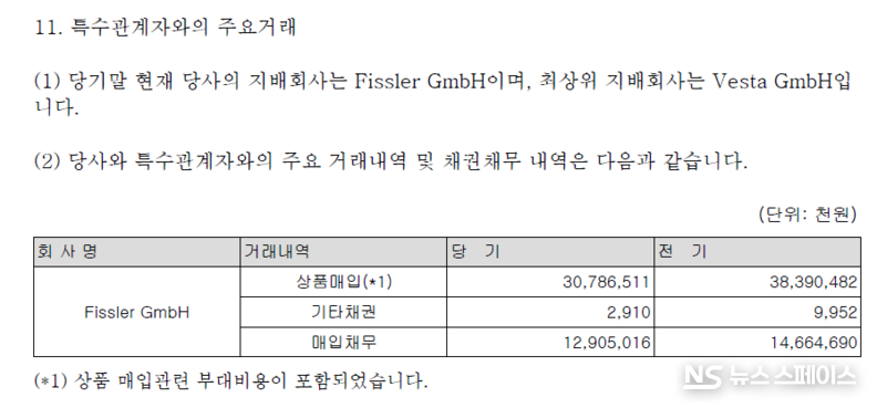 휘슬러코리아의 모든 지분은 독일 Fissler GmbH가 100% 보유하고 있으며, 최상위 지배회사는 Vesta GmbH다. 감사보고서에 따르면, 당기 Fissler GmbH로부터의 상품 매입액은 307억8,700만원(매입관련 부대비용 포함)으로 전체 매입의 67.77%를 차지했다. 전기(383억9,000만원, 의존도 75.81%)에 비해 의존도가 다소 완화됐으나, 여전히 매입 원가의 3분의 2 이상이 모회사에 귀속된다. 당기말 기준 Fissler GmbH에 대한 매입채무 잔액은 129억1,000만원에 달한다.
