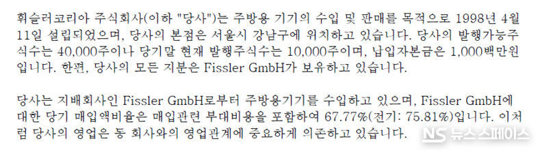 판매비와 관리비 427억원 가운데 절반을 훌쩍 넘는 231억4,000만원이 '지급수수료' 한 항목에 집중되는 비용구조의 기형성은 물론, 모회사 Fissler GmbH에 대한 원가 종속과 고착화된 손실 기조가 중장기 재무건전성에 심각한 경고등을 켜고 있다.