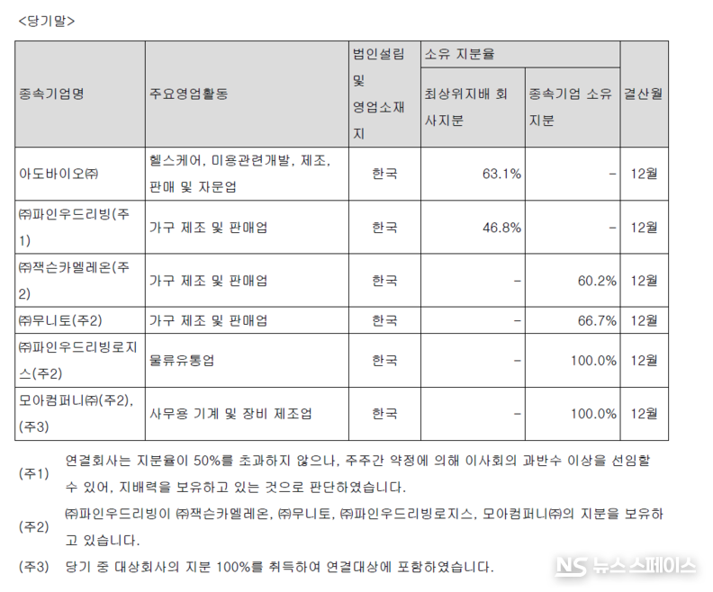 사업부문별로는 위생도기·수전금구 중심의 바스부문이 매출 1,957억원, 영업이익 168억원으로 회사 전체 이익의 90% 이상을 홀로 떠받치고 있다. 반면 욕실·주방 인테리어를 담당하는 BK부문(매출 369억원, 영업이익 14억원), 케어(렌탈)부문(매출 318억원, 영업이익 7억원), 자회사 파인우드리빙이 운영하는 가구부문(매출 361억원, 영업이익 1억 8,000만원)은 수익성이 극히 저조하다. 가구부문의 영업이익률은 0.5%에도 미치지 못해 사실상 이익 공헌도가 없는 수준이다.