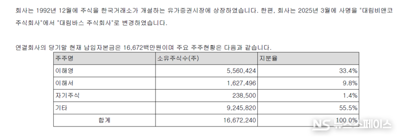 최대주주 이해영 회장(보유주식 5,560,424주, 지분율 33.35%)의 배당 수령 추정액은 약 10억원(5,560,424주 × 180원)이다. 특수관계인을 포함한 오너일가 전체 지분(약 49.85%)을 기준으로 하면 약 14억 7,000만원의 배당이 오너일가에 집중된다. 대림바스는 2013년 제46기부터 2025년 제58기까지 13회 연속 배당을 이어오고 있다.