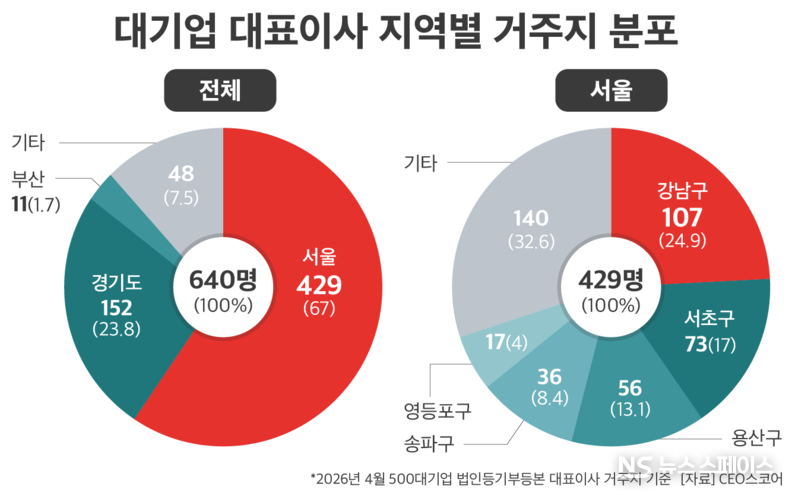 4월 29일 기업데이터연구소 CEO스코어(대표 조원만)가 법인등기부등본에 기재된 500대 기업 대표이사 총 640명의 주소지를 조사한 결과, 올해 4월 기준 586명(91.6%)이 수도권에 거주하는 것으로 나타났다.