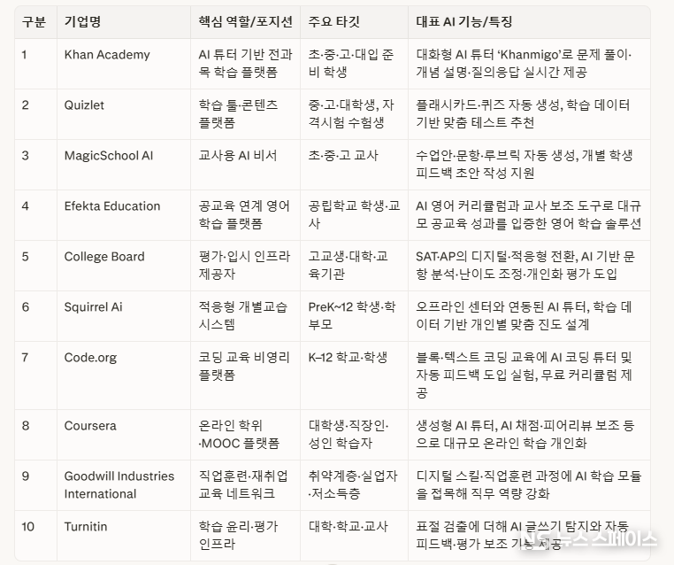 TIME이 꼽은 2026년 가장 영향력 있는 교육 기업 10곳은 칸아카데미(Khan Academy), 퀴즐렛(Quizlet), 매직스쿨AI(MagicSchool AI), 에펙타 에듀케이션(Efekta Education), 칼리지보드(College Board), 스쿼럴AI(Squirrel Ai), 코드닷오르그(Code.org), 코세라(Coursera), 굿윌 인더스트리얼 인터내셔널(Goodwill Industries International), 터니틴(Turnitin)이다.