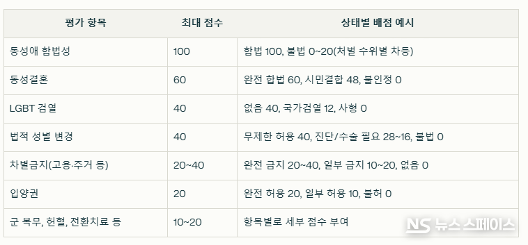 한국은 국제적으로 볼 때 성소수자 인권 및 포용성 지수가 낮은 편이다. SOGI법정책연구회의 '한국 LGBTI 인권 현황' 보고서에 따르면, 2022년 6월 기준 한국의 무지개 지수(Rainbow Index)는 10.56%로, 이는 유럽 49개국 중 44위에 해당하는 수치다. 이는 한국의 성소수자 인권 보호 수준이 낮음을 나타내며, 성소수자에 대한 사회적 수용도가 제한적임을 시사한다.