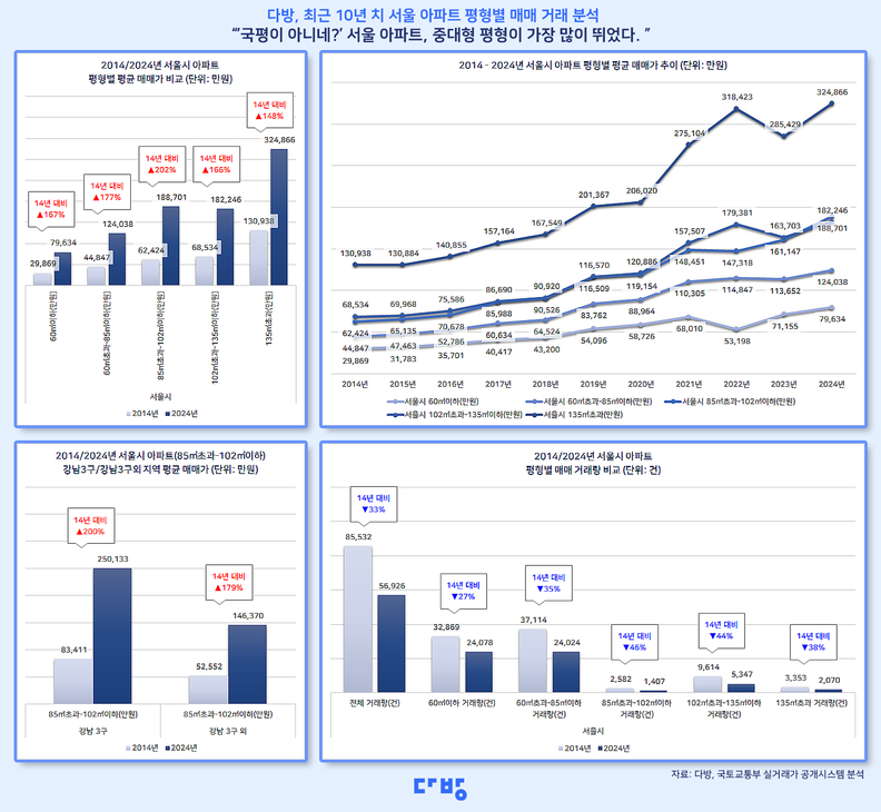국내 최대 부동산 정보 플랫폼 ‘다방’은 국토부 실거래가를 기반으로 2014년부터 2024년까지의 서울 지역 아파트 매매 거래를 분석했다. 그 결과 ‘중대형 평형’으로 불리는 전용면적 85㎡ 초과 102㎡ 이하 아파트의 평균 매매가가 2014년 6억2424만원에서 2024년 18억8701만원으로 202% 상승하며 가장 많이 오른 것으로 집계됐다.