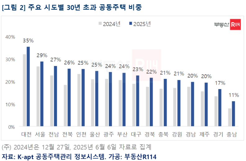 시도별로 30년 초과 공동주택 비중을 살펴보면 ▲대전(35%) ▲서울(29%) ▲전남(27%) ▲전북(26%) ▲인천(25%) ▲울산(25%) 순으로 나타났다. 공동주택 중 3분의 1이상이 노후단지로 확인된 대전은 91년~94년 준공 물량이 몰렸던 서구 둔산지구(둔산동, 월평동 일대) 위주로 노후화가 뚜렷했다.