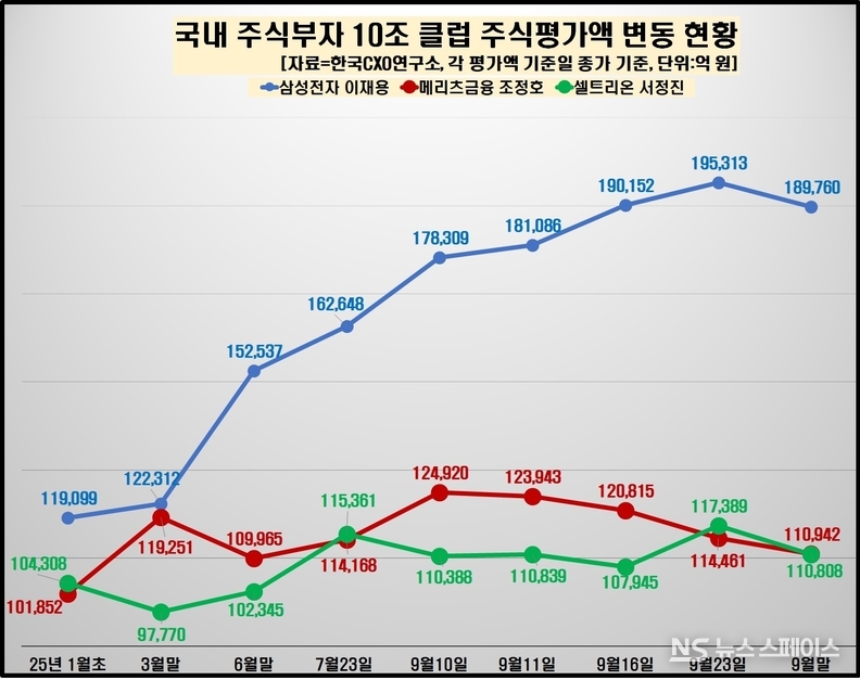 9월 말 기준 주식재산 1위는 삼성전자 이재용 회장이 차지했다. 이재용 회장의 주식재산은 올해 초 11조9099억원→3월 말 12조2312억원→6월 말 15조2537억원으로 꾸준히 늘더니 9월 말에는 18조9760억원으로 높아졌다. 특히 이재용 회장은 이재명 정부가 들어선 이후 주식가치가 상승 바람을 타서 지난 9월 11일에는 18조1086억원으로 이건희 선대 회장에서 주식을 물려받은 이후 처음으로 18조원대에 진입했었고, 같은 달 16일에는 19조152억원으로 19조원대에도 진입했다. 특히 지난달 23일에는 이재용 회장의 주식평가액이 19조5313억원까지 올라 20조원 돌파를 코앞에 두기도 했었다.