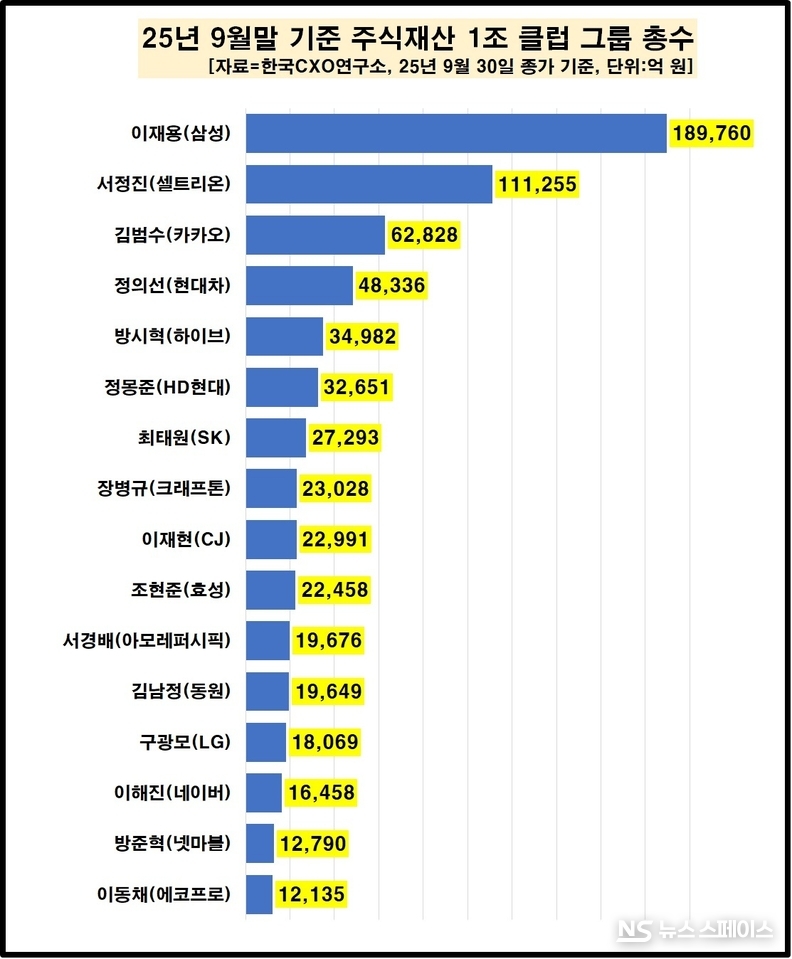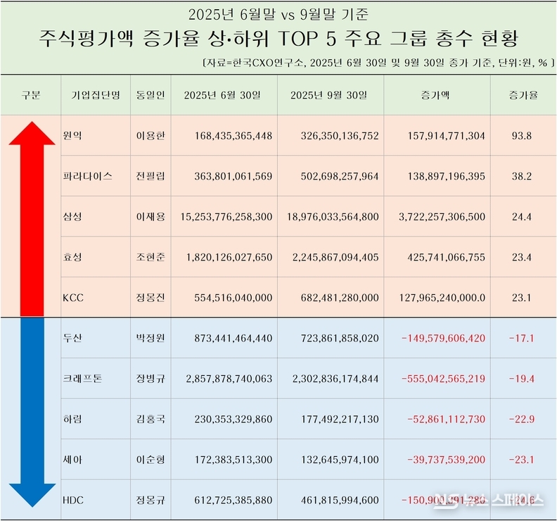 기업분석전문 한국CXO연구소는 10월 1일 이 같은 내용을 골자로 한 ‘2025년 3분기(6월 말 대비 9월 말 기준) 주요 그룹 총수 주식평가액 변동 조사’ 도출 결과를 발표했다. 조사 대상은 공정거래위원회가 관리하는 대기업집단 중 올 9월 말 기준 주식평가액이 1000억원 넘는 그룹 총수 45명이다.