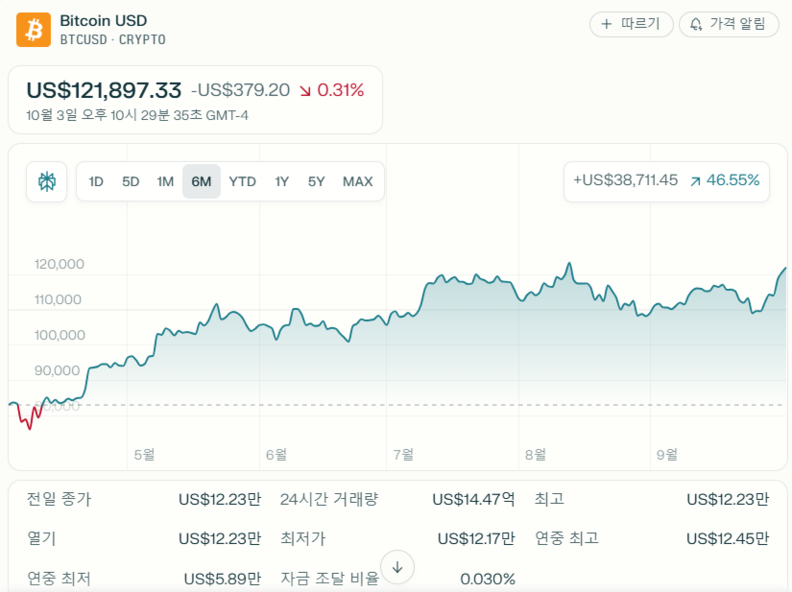 금은 최근 가격이 급등하며 3885.77달러(트로이 온스당, 2025년 10월 3일 기준)까지 상승했다. 이는 지난 1년간 약 46.5% 상승한 수치로, 비트코인이 금과 변동성 면에서 거의 근접하면서 기관과 개인 모두 비트코인을 금과 함께 가치 저장 수단으로 인식하는 추세가 강화되고 있음을 보여준다.
