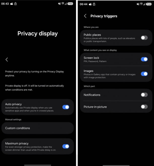 phonearena, GSMArena, Counterpoint Research에 따르면, 유출된 원UI 8.5 버전 내 코드와 스크린샷을 살펴보면 프라이버시 디스플레이는 AI 기반의 삼성 디스플레이 ‘Flex Magic Pixel’ 기술을 적용했다. 이 기술은 OLED 픽셀을 실시간으로 제어해 정면에서 볼 때는 선명한 화면을 제공하면서도 측면에서 볼 경우 화면이 흐리거나 거의 보이지 않게 만들어준다.