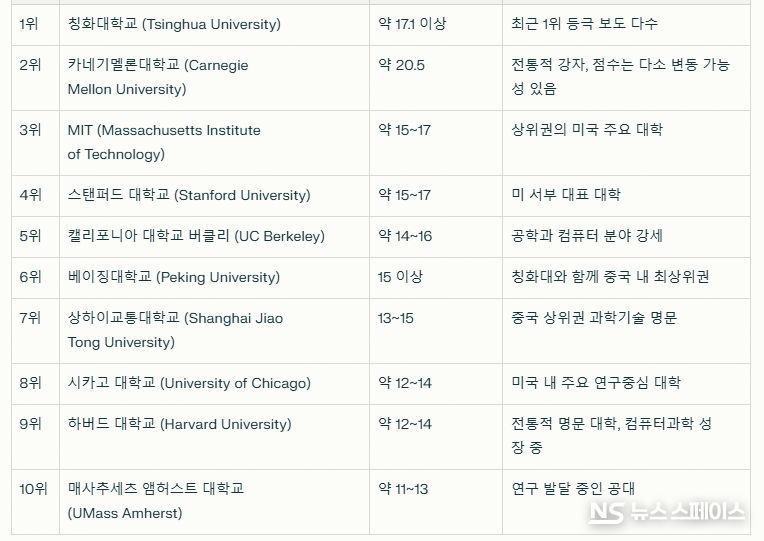 상위 10위권 내 중국 대학의 약진은 두드러진다. 칭화대 외에도 2위는 카네기멜론대, 3위는 MIT, 4위는 스탠퍼드대, 5위는 UC버클리대가 차지했다.