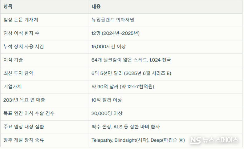 자금 조달 측면에서 뉴럴링크는 2025년 6월, 약 6억5000만 달러(약 8000억원)의 시리즈 E 투자 유치를 발표했으며, 기업가치는 약 90억 달러(약 12조7000억원)로 평가받고 있다. 이 자금은 임상 확대와 차세대 장치 개발에 투입될 예정이다.