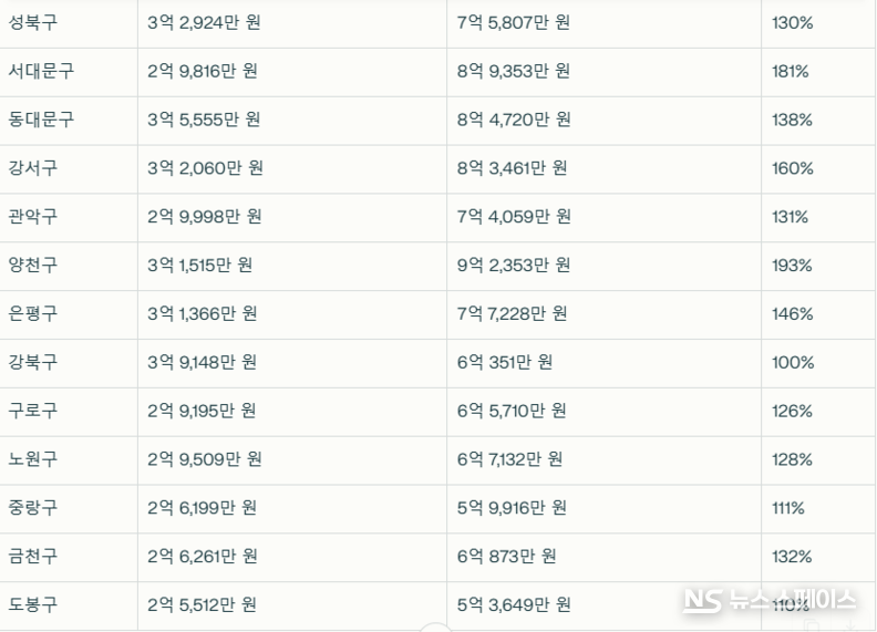 인기 도심권인 마포구(13억4479만원, 217%), 용산구(14억9531만원, 192%)도 200%에 가까운 가파른 상승세를 보여, 강남권과 중심업무지구 인접 지역의 강세를 입증했다.