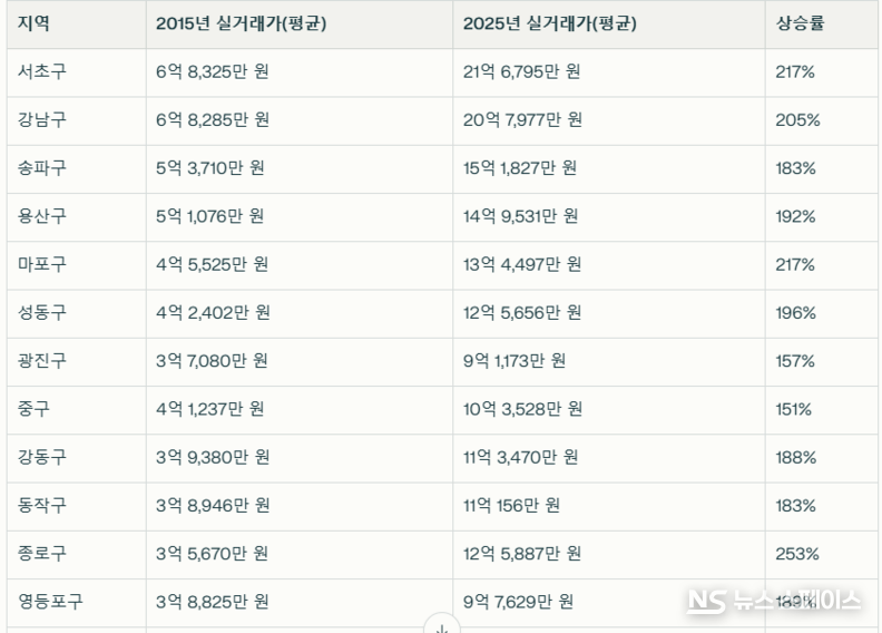 가장 큰 변동을 보인 곳은 종로구로, 2015년 3억5670만원이었던 평균 실거래가가 2025년엔 12억5887만원으로 253% 폭등해 서울에서 상승률 1위를 차지했다. 뒤를 이어 서초구(217%), 마포구(217%), 강남구(205%), 성동구(196%), 용산구(192%) 등 이른바 강남3구와 도심권이 상위권을 석권했다.