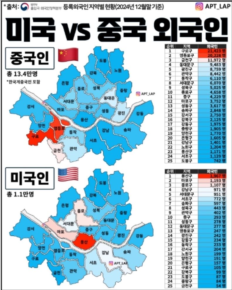 [랭킹연구소] "중국인은 구로·금천, 미국인은 강남·서초"…서울 외국인 아파트 보유도 극심한 양극화