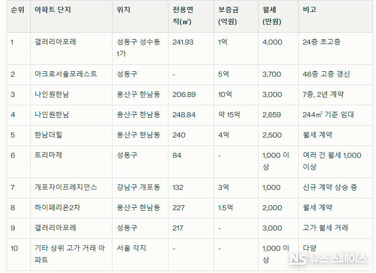 특히 성동구 성수동1가 '갤러리아포레' 전용 241.93㎡(24층)는 6월 보증금 1억원에 월세 4000만원 조건으로 체결되어 서울 아파트 월세 최고가를 기록했다.