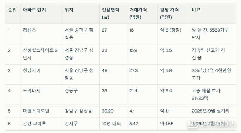 국토교통부 실거래가 공개시스템, KB국민은행 주택가격 동향에 따르면, 2025년 들어 서울 송파구 잠실동 '리센츠' 전용 27㎡(약 8평)는 지난 9월 16억원에 거래돼 평당 1억원을 넘겼다. 강남구 삼성동 '삼성힐스테이트2단지' 전용 38㎡(11.5평)은 15억9000만원에 거래됐으며, 40㎡ 전후 급격한 시세 상승세를 보였다.