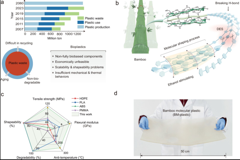[뉴스스페이스=이종화 기자] 최근 중국 북동임업대학교 연구진이 기존 석유 기반 플라스틱에 견줄 만한 뛰어난 강도와 빠른 생분해성을 모두 갖춘 혁신적인 대나무 분자 플라스틱을 개발했다다. 이 신소재는 무독성 알코올 용매를 통해 대나무 셀룰로오스를 분자 단위로 용해한 뒤, 셀룰로오스 사슬을 촘촘하게 재조립하여 높은 강도와 안정적인 형성성을 확보했다. 이 연구결과는 Nature Communications에 발표됐다.