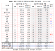 [뉴스스페이스=조일섭 기자] 코스피가 연일 상승곡선을 그리며 ‘4000피 시대’를 열어젖혔지만, 주요 상위 그룹으로의 시가총액 쏠림 현상이 더욱 심화되는 것으로 나타났다. 산업간 경기 흐름이 엇갈리면서 그룹별 시가총액 순위가 급변해 반도체·조선·방산·원자력·전력 계열사를 보유한 그룹들이 상위권으로 부상한 가운데, 5대 그룹이 전체 증시 시총의 절반 이상을 차지하는 ‘대형주 집중’이 가속화됐다. 연초 대비 시총 증가율이 가장 높은 그룹은 효성이었다. 11월 11일 리더스인덱스(대표 박주근)가 91개 대기업집단에 소속된 상장사 368개의 시가총액을 올해 1월 2일과 11월 3일 종가 기준으로 비교 분석한 결과, 전체 시가총액은 1661조7387억원에서 3030조5177억원으로 82.4% 증가했다. 불과 10개월 만에 1369조원 가까이 늘어난 것이다. 같은 기간 한국 증권 시장 전체 시총(코스피·코스닥·코넥스 포함)은 2310조9938억원에서 3963조1134억원으로 71.5% 증가했다. 이 가운데 시총 상위 5대 그룹(삼성·SK·현대차·LG·HD현대)이 차지하는 비중은 연초 45.9%에서 52.2%로 6.3%포인트(p) 상승, 전체의 절반을 넘어서며 대형 그룹