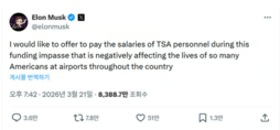 [뉴스스페이스=김정영 기자] 미국 국토안보부(DHS) 셧다운 5주째 접어든 가운데, 테슬라 CEO 일론 머스크가 교통안전청(TSA) 약 5만명 직원 급여를 개인 자금으로 지급하겠다는 파격 제안을 내놨다. 머스크는 3월 21일(현지시간) 자신의 소셜미디어 X에 "이번 예산 교착으로 공항 이용자 삶에 악영향을 미치는 동안 TSA 직원 급여를 내가 지급하겠다"고 밝히며 여야 갈등에 직접 개입했다. 트럼프 행정부의 강경 이민 단속 정책을 둘러싼 여야 대치로 DHS 예산 처리가 지연되면서 지난 2월14일부터 부분 셧다운에 돌입했다. 민주당은 ICE(이민세관단속국)의 마스크 착용 해제, 바디캠 의무화 등을 요구하며 예산안을 거부, 공화당은 이를 '정치적 게임'으로 비판했다. 이로 인해 TSA 직원들은 무급 근무를 강요받고 있으며, 3월27일 두 번째 급여 지급일을 앞두고 재정 압박이 고조되고 있다. TSA는 미국 전역 440개 공항 보안 검색을 담당하는 핵심 기관으로, 직원 수는 약 5만명에 달한다. 연평균 급여는 신입 기준 약 4만달러(약 5400만원)부터 시작해 경력에 따라 6만~7만5000달러(약 8100만~1억원) 수준이며, 고위직은 16만달러(약 2억1000만